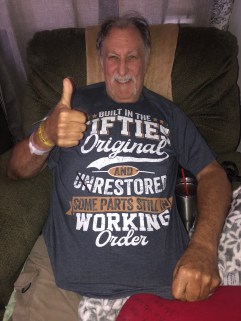 He proudly wears his new shirt, but we had to alter it to say “RESTORED!”